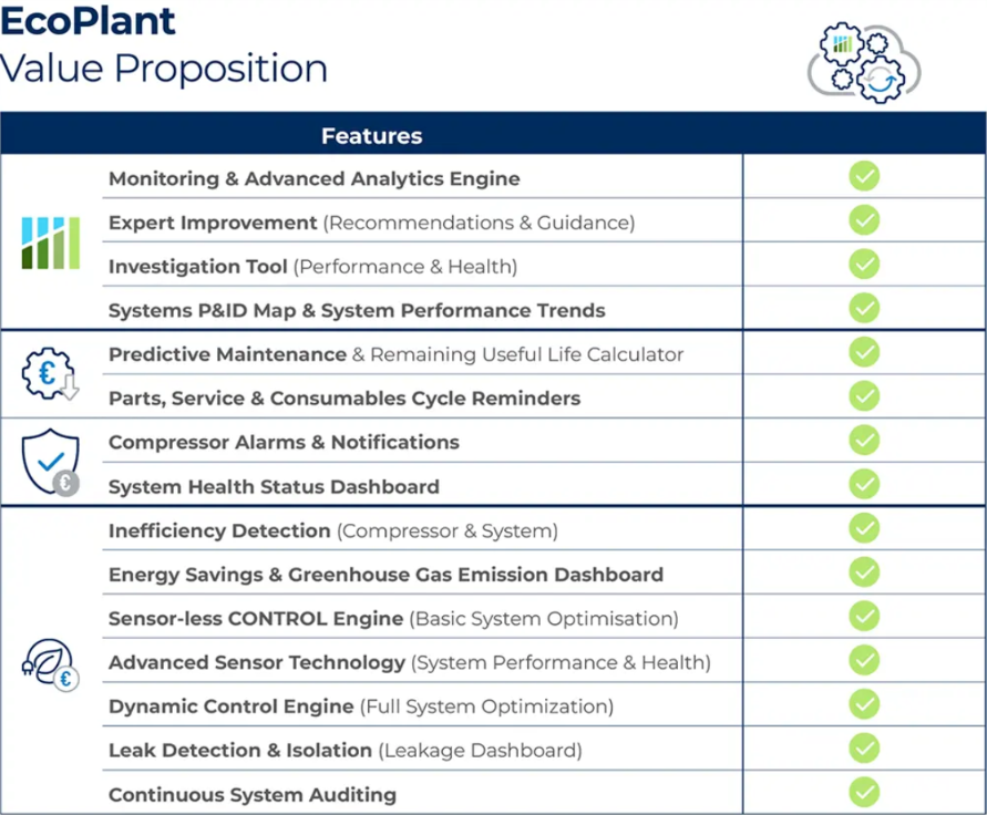 Унікальна можливість Ecoplant — це створення передбачуваних алгоритмів, що аналізують щоденне, тижневе та сезонне споживання енергії. На основі цих даних система динамічно керує стисненим повітрям відповідно до виробничих профілів, мінімізуючи надлишкове споживання, втрати енергії та зайві витрати на комунальні послуги.